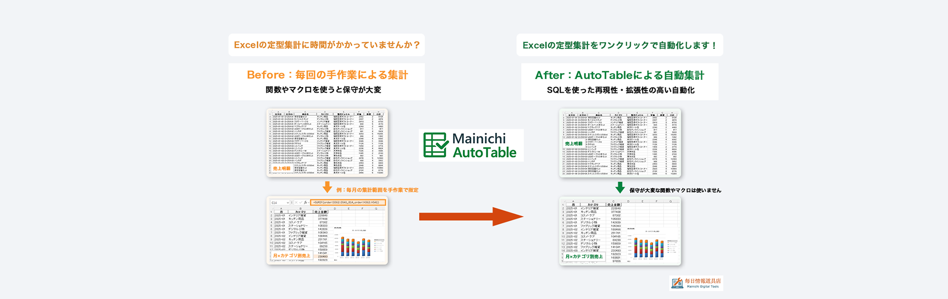 毎日情報道具店(Mainichi Digital Tools)は、毎日のオフィス作業を楽にする道具(ソフトウェアやサービス)を提供します。Excel/Word/PowerPointのデータ処理を、Python/SQLなどの技術を用いて自動化します。